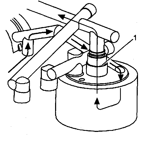 If the oil filter becomes plugged, the pressurized oil is diverted around the top of the oil filter. The oil filter bypass valve (1) is forced open, allowing the oil to continue on to the oil cooler and engine oil passages. No oil filtration occurs because the oil is not allowed into the oil filter.