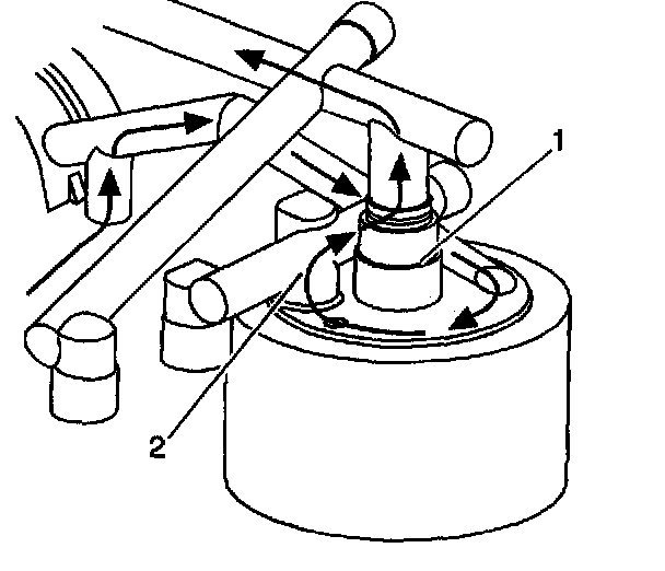 If both the oil filter and the oil cooler are plugged, the pressurized oil is routed around the top of the oil filter, through the oil filter bypass valve (2), through the oil cooler bypass valve (1) and directly into the engine oil passages. Lubrication still occurs, but the oil is not filtered or directed through the oil cooler.