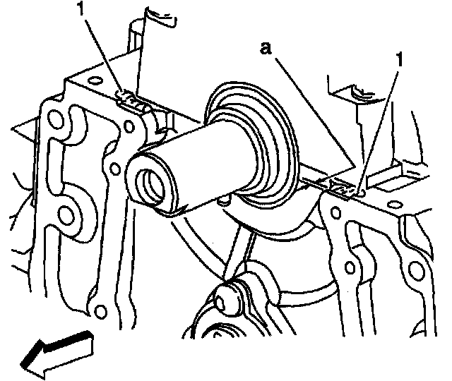 3. Apply sealant GM P/N 12346286 or equivalent in two places (1) on the engine block where the front cover meets the oil pan.