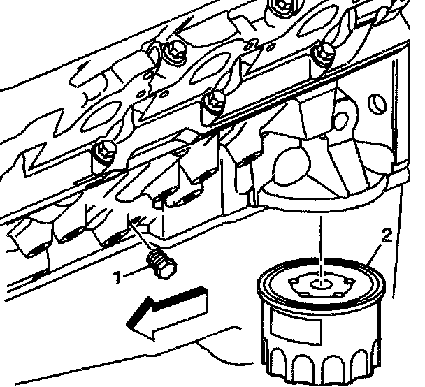 4. Remove the oil filter (2) from the engine block and allow the engine oil to drain completely.
