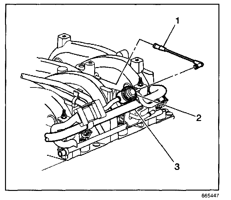3. Install the fuel rail assembly (1) to the intake manifold.