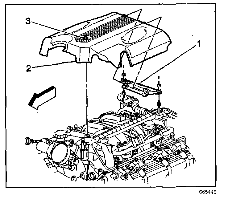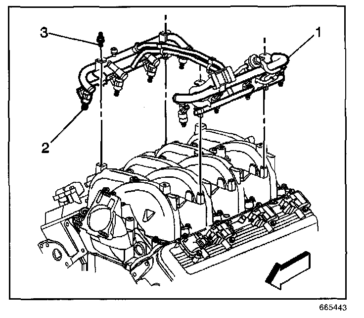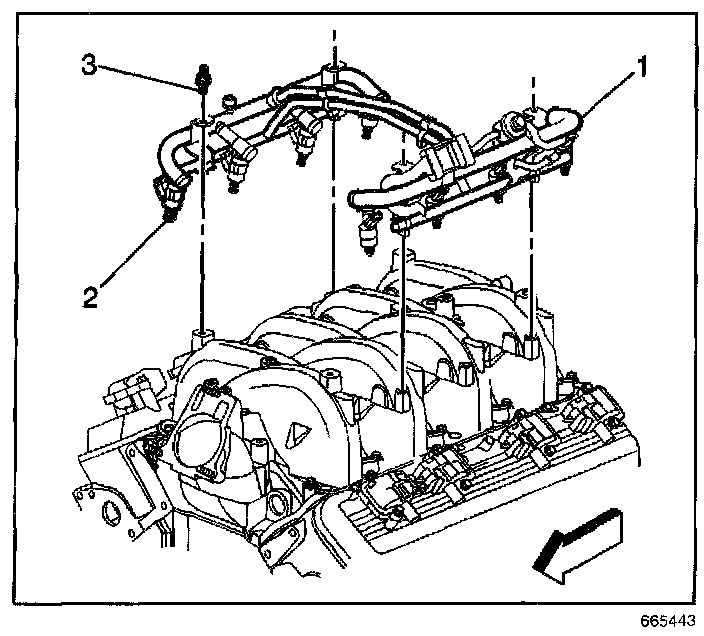 16. Remove the fuel rail attaching bolts (3).