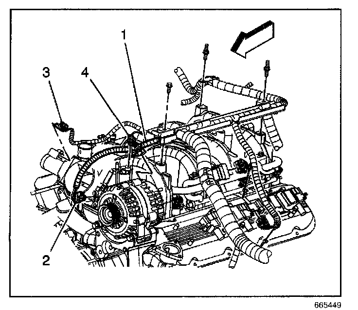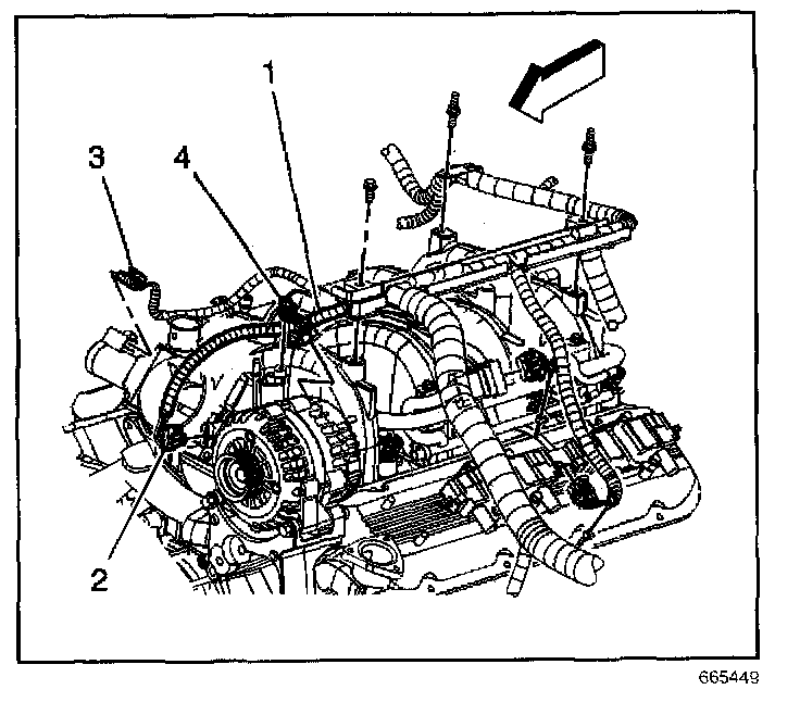 8. Remove the upper engine wire harness bracket studs and position the upper engine wire harness aside.