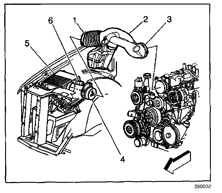 1. Loosen the clamps on the air intake duct (2) at the throttle body (3) and at the mass air flow/intake air temperature (MAF/IAT) sensor (1).