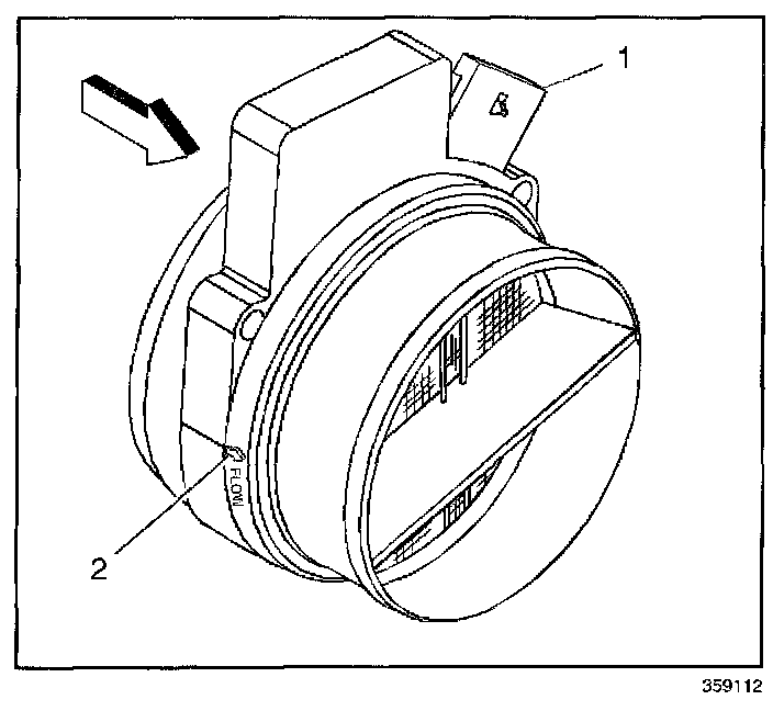 IMPORTANT: If the MAF/IAT sensor is installed backwards the fuel system goes rich. An arrow (2) cast into the plastic portion of the sensor indicates proper air flow direction. The arrow must point toward the engine.