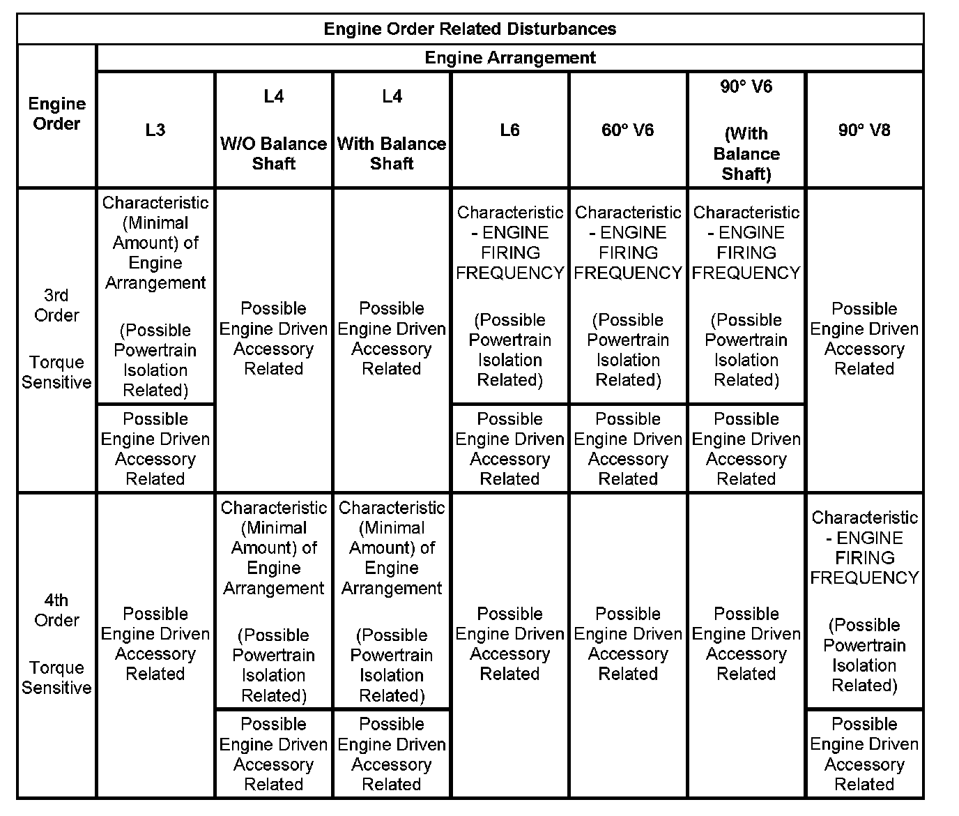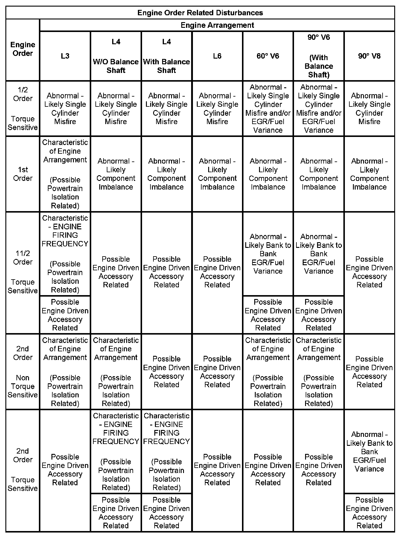 3. If the dominant frequency (Hz) recorded during duplication of the disturbance and the engine firing frequency (Hz) just calculated ARE related, then an engine FIRING FREQUENCY related disturbance is present. (Engine firing frequency disturbances are usually related to improper isolation of a component.) Refer to the Engine Order Related Disturbances table.