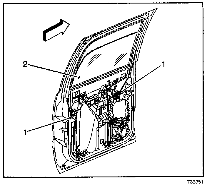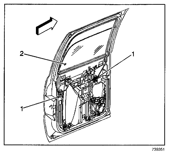 9. Remove the window glass (2) from the door by sliding the window glass out through the top.