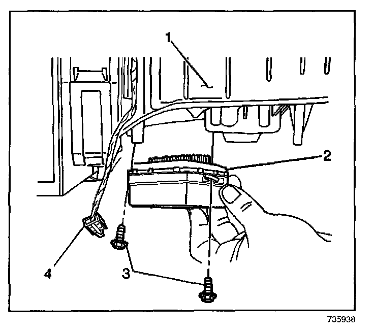 1. Install the blower motor control processor (2) to the HVAC module (1).