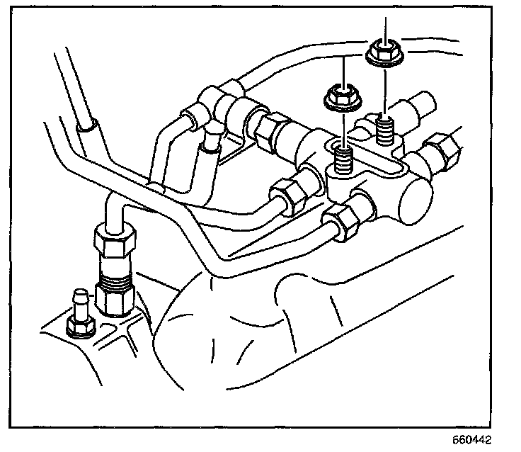 The fuel junction block is located between the left and right fuel rail assemblies. The fuel junction block consists of the following components: