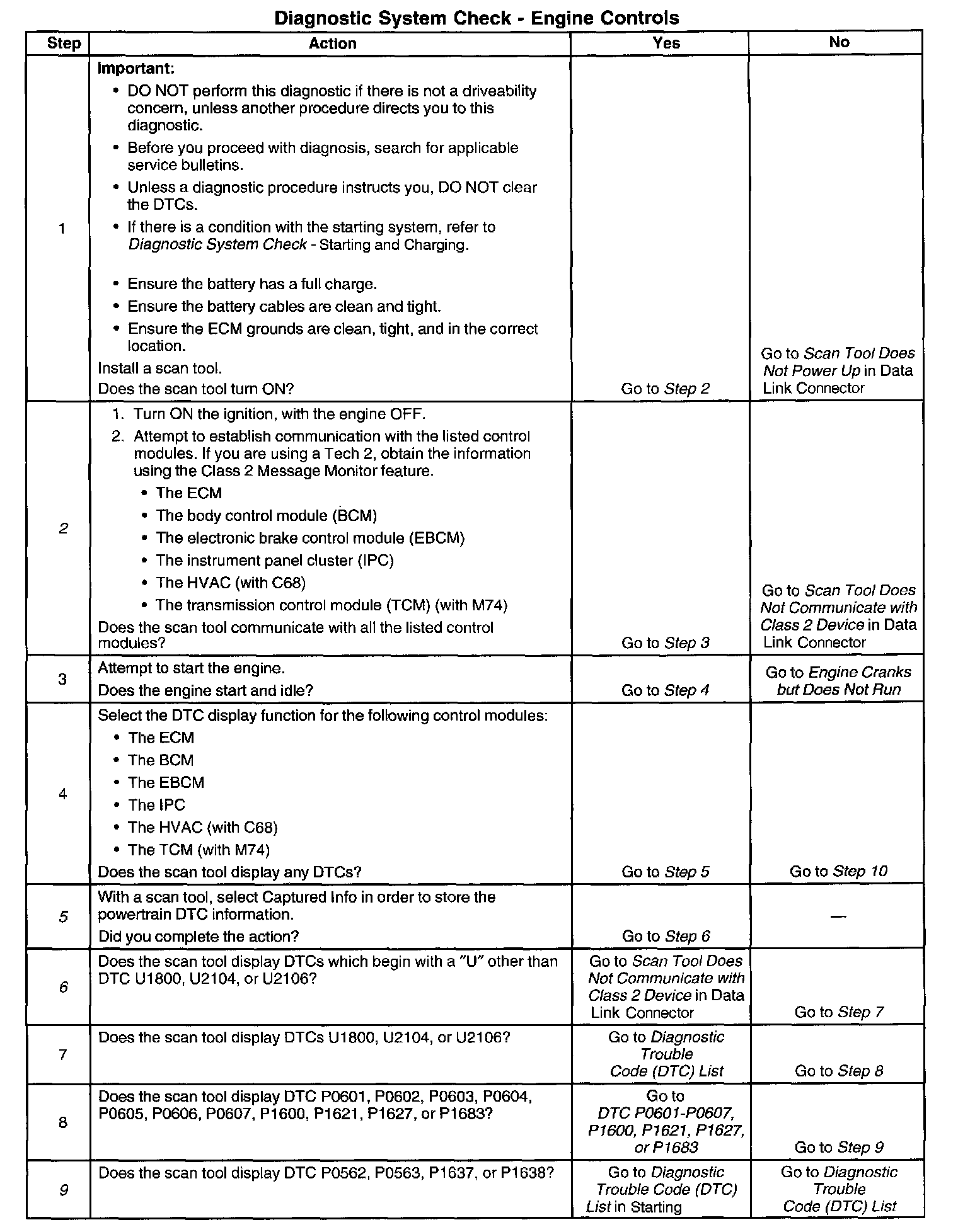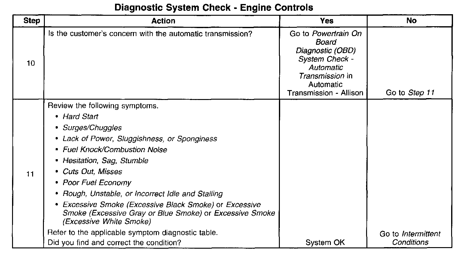 The Diagnostic System Check - Engine Controls is an organized approach to identifying a condition that is created by a malfunction in the electronic engine control system. The Diagnostic System Check must be the starting point for any driveability concern. The Diagnostic System Check directs the service technician to the next logical step in order to diagnose the concern. Understanding, and correctly using the diagnostic table reduces diagnostic time, and prevents the replacement of good parts.