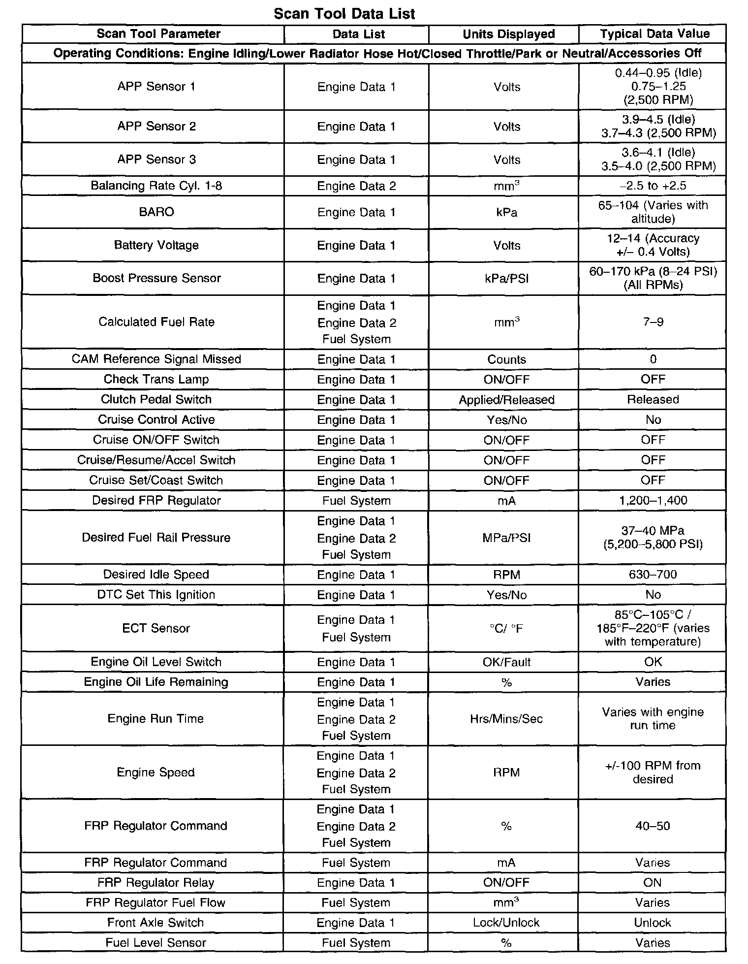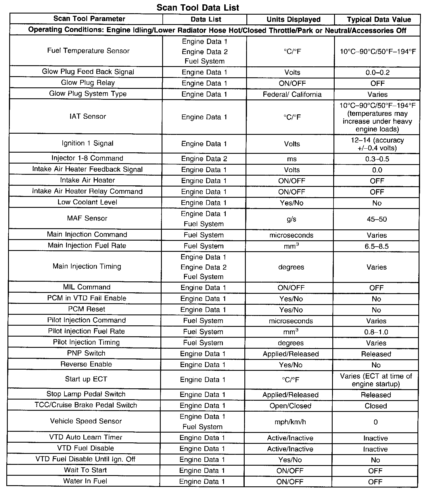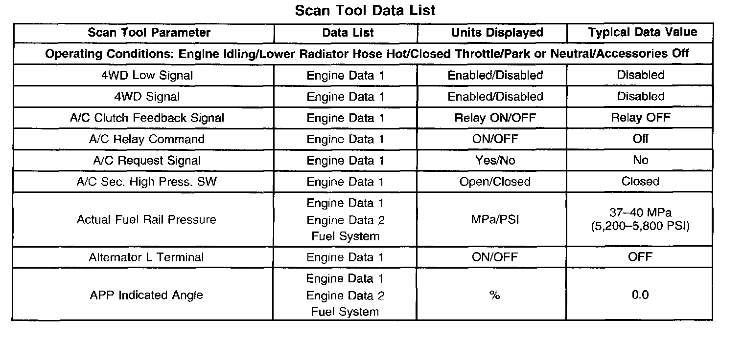 Use the scan tool data listed in this table for comparison after the On-Board Diagnostic system check and finding the on-board diagnostics function properly with no diagnostic codes displayed.