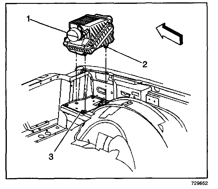 3. Grasp the air filter assembly (1) and pull the assembly retaining pins (2) away from the retaining grommets (3) and remove the assembly.