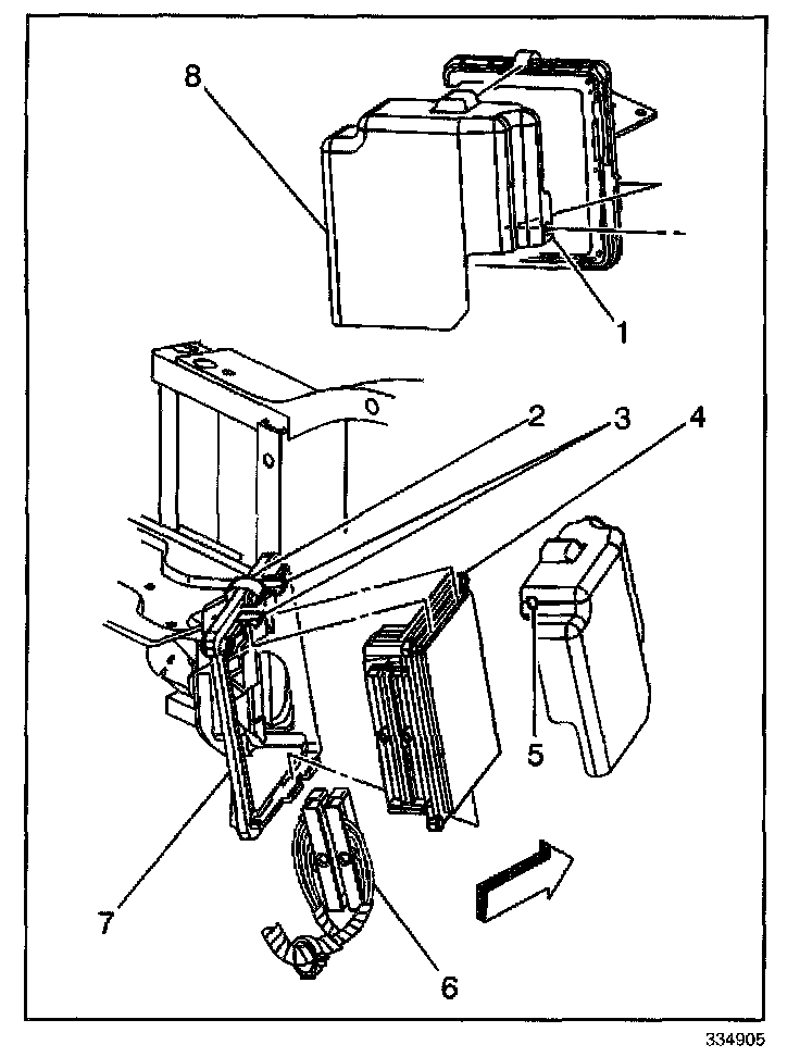 4. Install the PCM cover (8) to the PCM mounting bracket (7), ensuring the mounting tabs on the PCM mounting bracket are engaged into the mounting holes in the PCM cover.