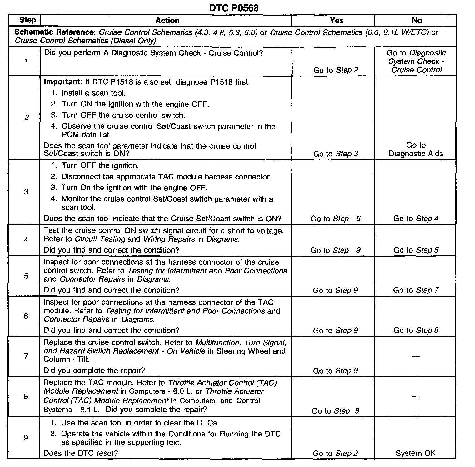 CIRCUIT DESCRIPTIONThe cruise control Set/Coast switch is an input to the Throttle Actuator Control (TAC) module. The cruise control information is supplied to the PCM via serial data. This input allows the PCM and TAC module to control and hold a requested speed. The cruise control Set/Coast switch sends a ignition positive voltage signal to the TAC module when the momentary switch is applied. This DTC sets if the TAC module senses a voltage on the Set/Coast switch signal circuit when the voltage is not expected.