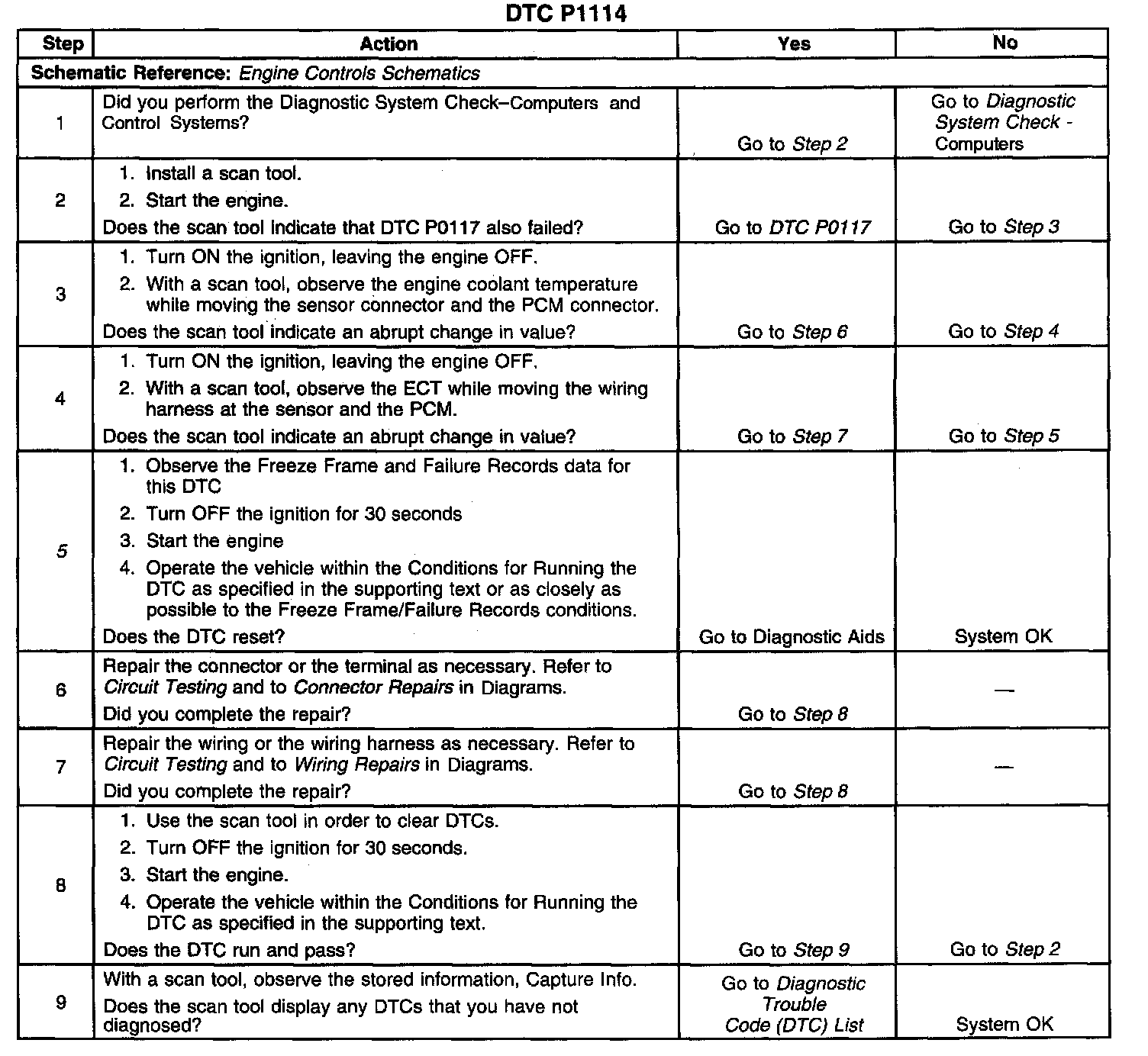 ^ An intermittent short to ground in the ECT sensor signal circuit could result in a DTC P1114. If a low ECT voltage reading is present, indicating a high temperature, additional sensor circuit voltage codes could be set. Refer to any non-intermittent DTCs that are set.