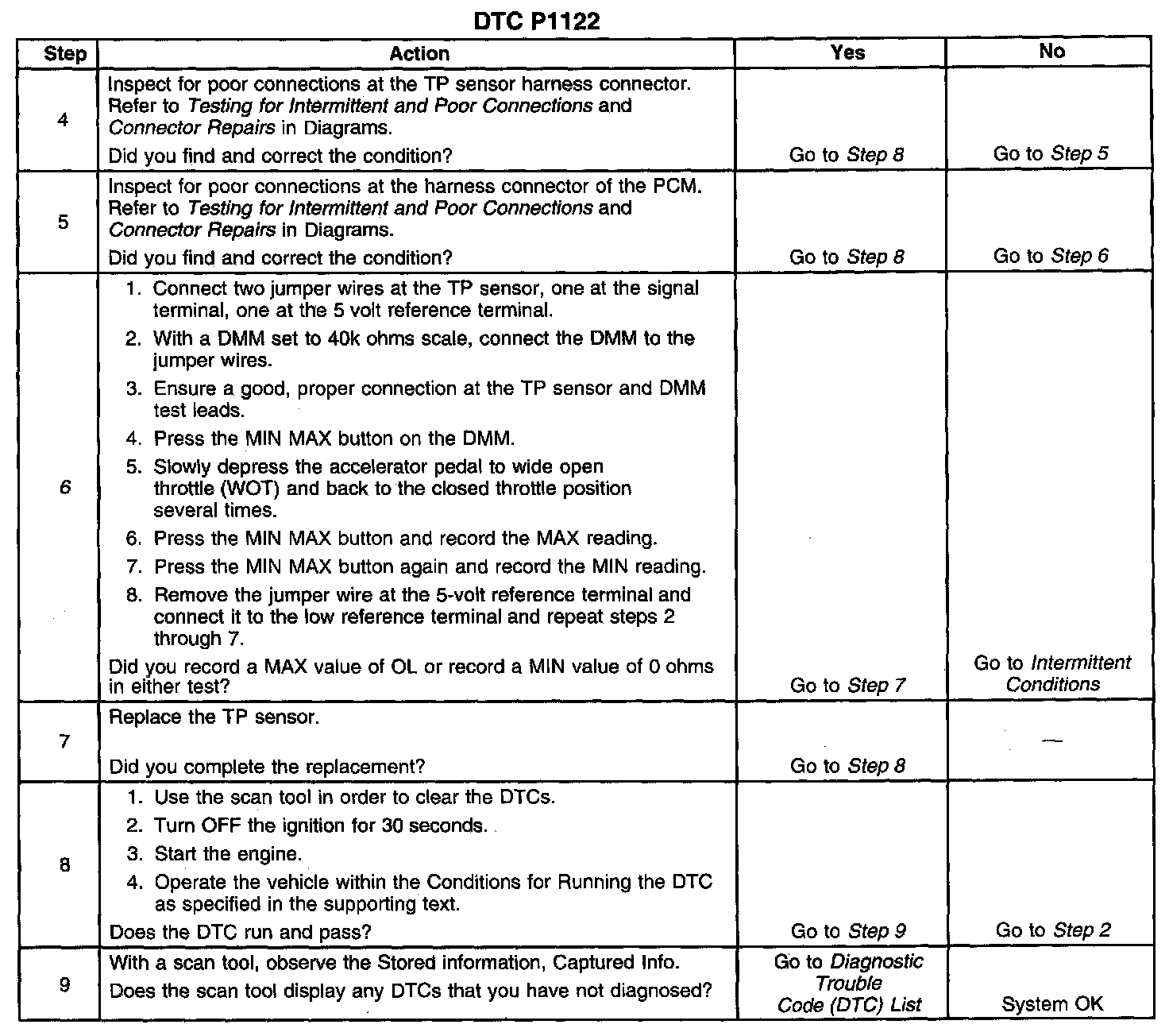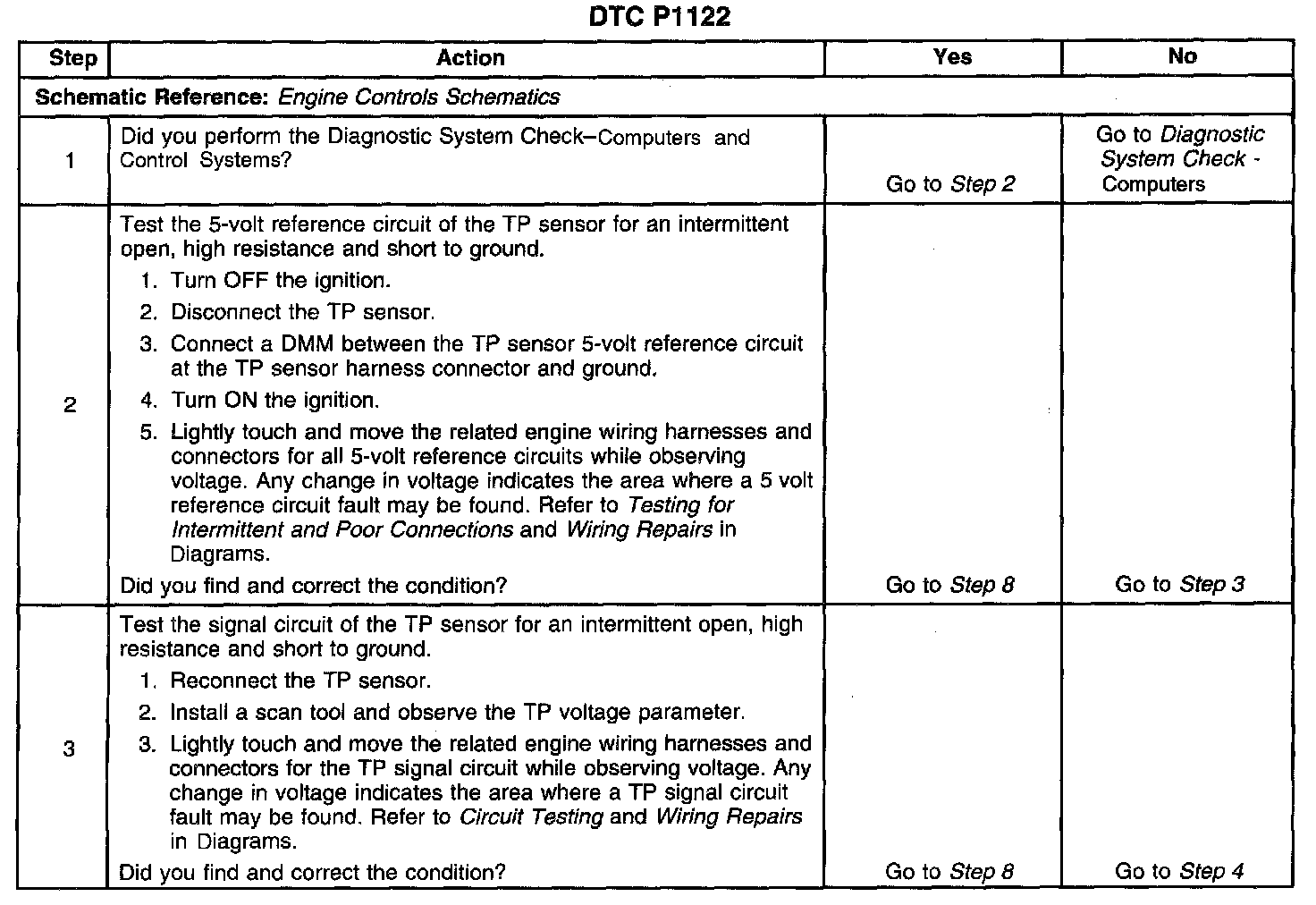 CIRCUIT DESCRIPTIONThe Throttle Position (TP) sensor is used by the Powertrain Control Module (PCM) to determine the throttle plate angle for various engine management systems. The TP sensor is a potentiometer type sensor with three circuits; 5 volt reference, low reference, and signal. Rotation of the TP sensor rotor from the closed throttle position to the Wide Open Throttle (WOT) position provides the PCM with a signal voltage from below 1.0 volt to greater than 4.0 volts through the TP sensor signal circuit. If the PCM detects an intermittent excessively low signal voltage, This DTC will set.