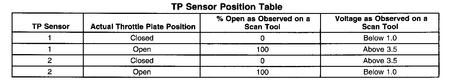 The table shows the percentage and voltage readings of the scan tool based on the position of the TP.
