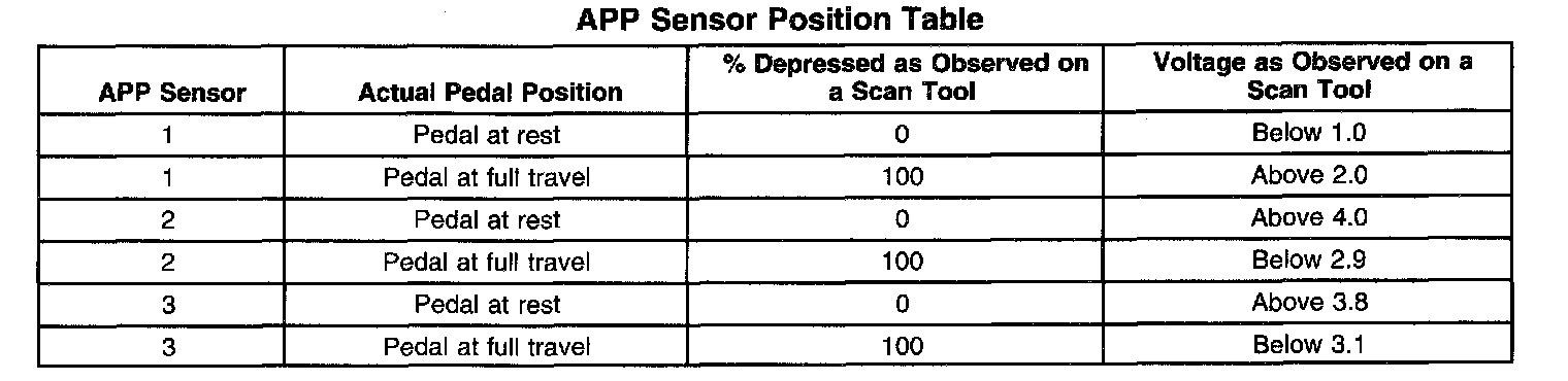 The table shows the percentage and voltage readings of the scan tool based on the position of the APP.