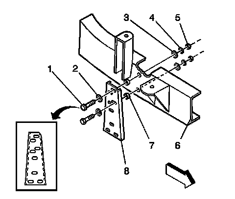 5. Remove the rear bracket retainers (1), and remove the bracket (8) from the vehicle.