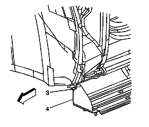 6. With an assistant install the retainer (3) attaching the assist step bracket (4) to the lower front fender.