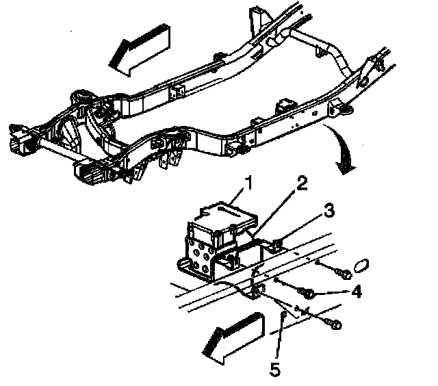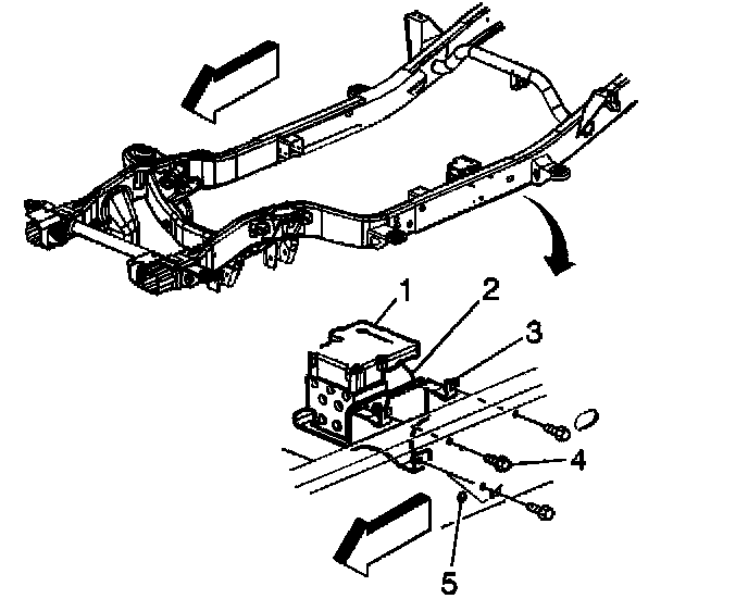 5. Remove the bolts (4) securing the EHCU mounting bracket (3) to the frame rail (5).