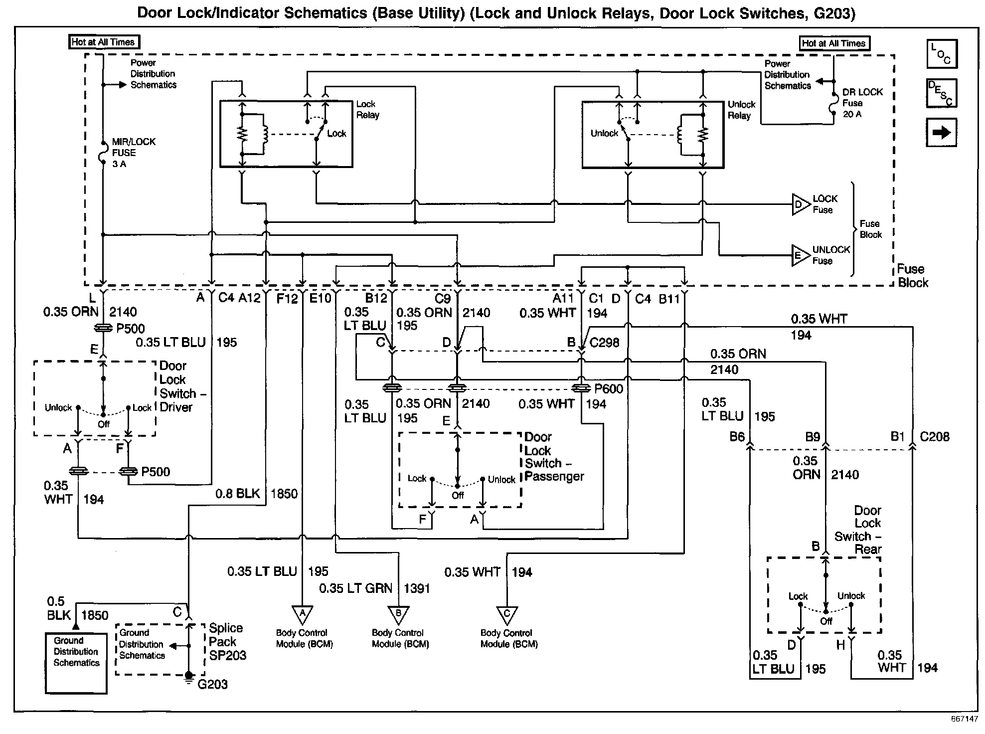 Door Lock/Indicator Schematics: Base Utility (Lock and Unlock Relays, Door Lock Switches, G203):