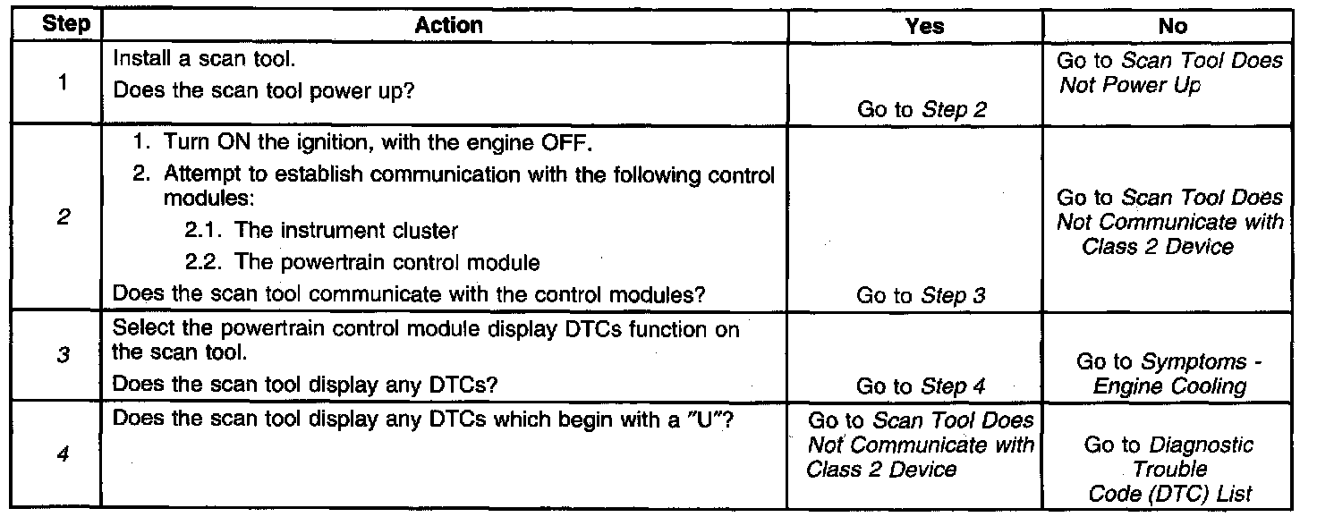 2. Lack of communication may be due to a partial malfunction of the class 2 serial data circuit or due to a total malfunction of the class 2 serial data circuit. The specified procedure will determine the particular condition.