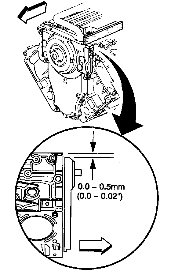 7.2. Insert a feeler gauge between the front cover and the straight edge tool. The cover must be flush with the oil pan surface or no more than 0.5 mm (0.02 inch) below flush.