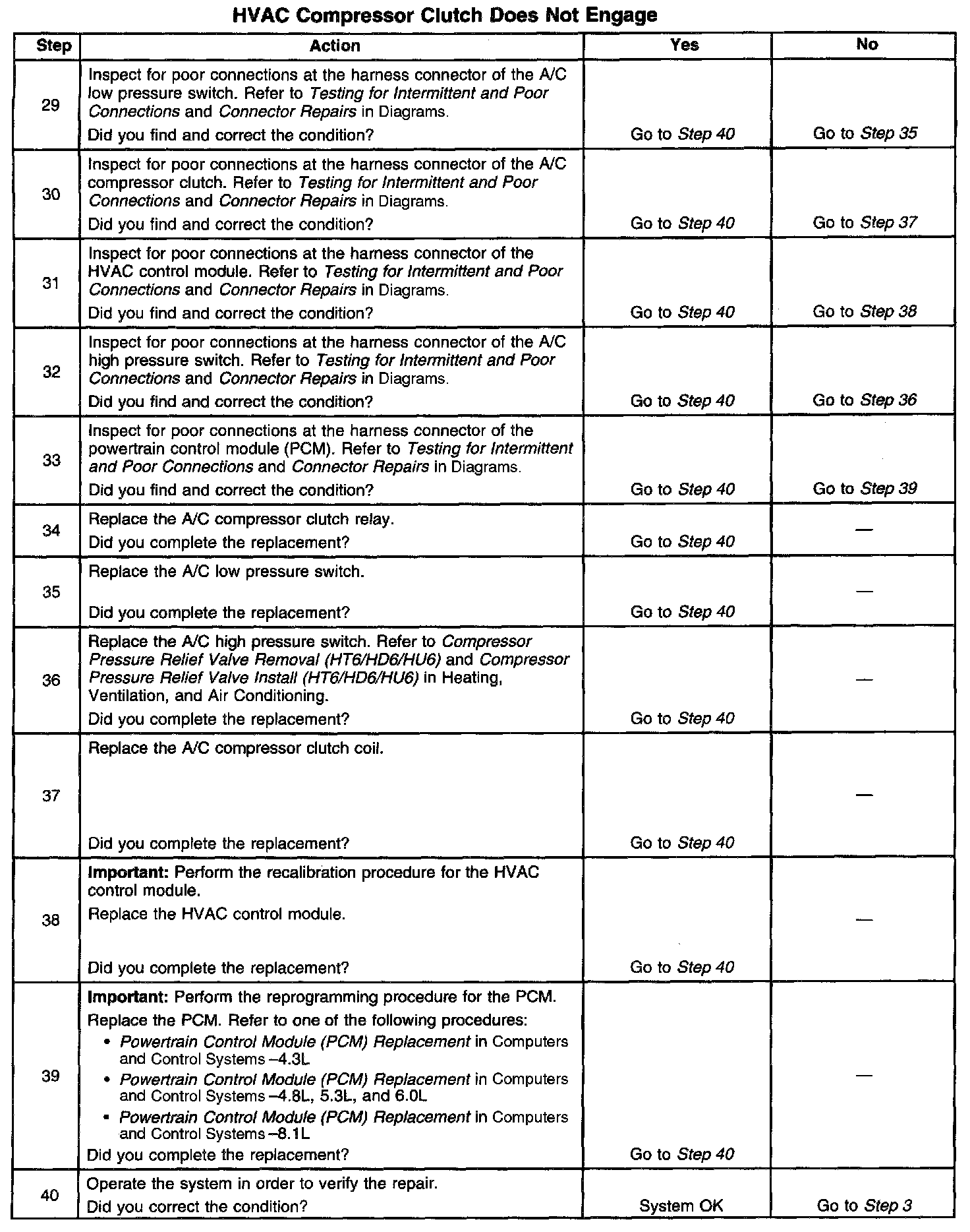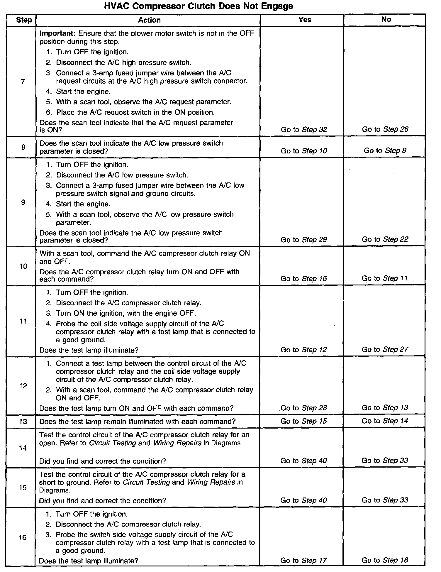 The numbers below refer to the step numbers on the diagnostic table.
