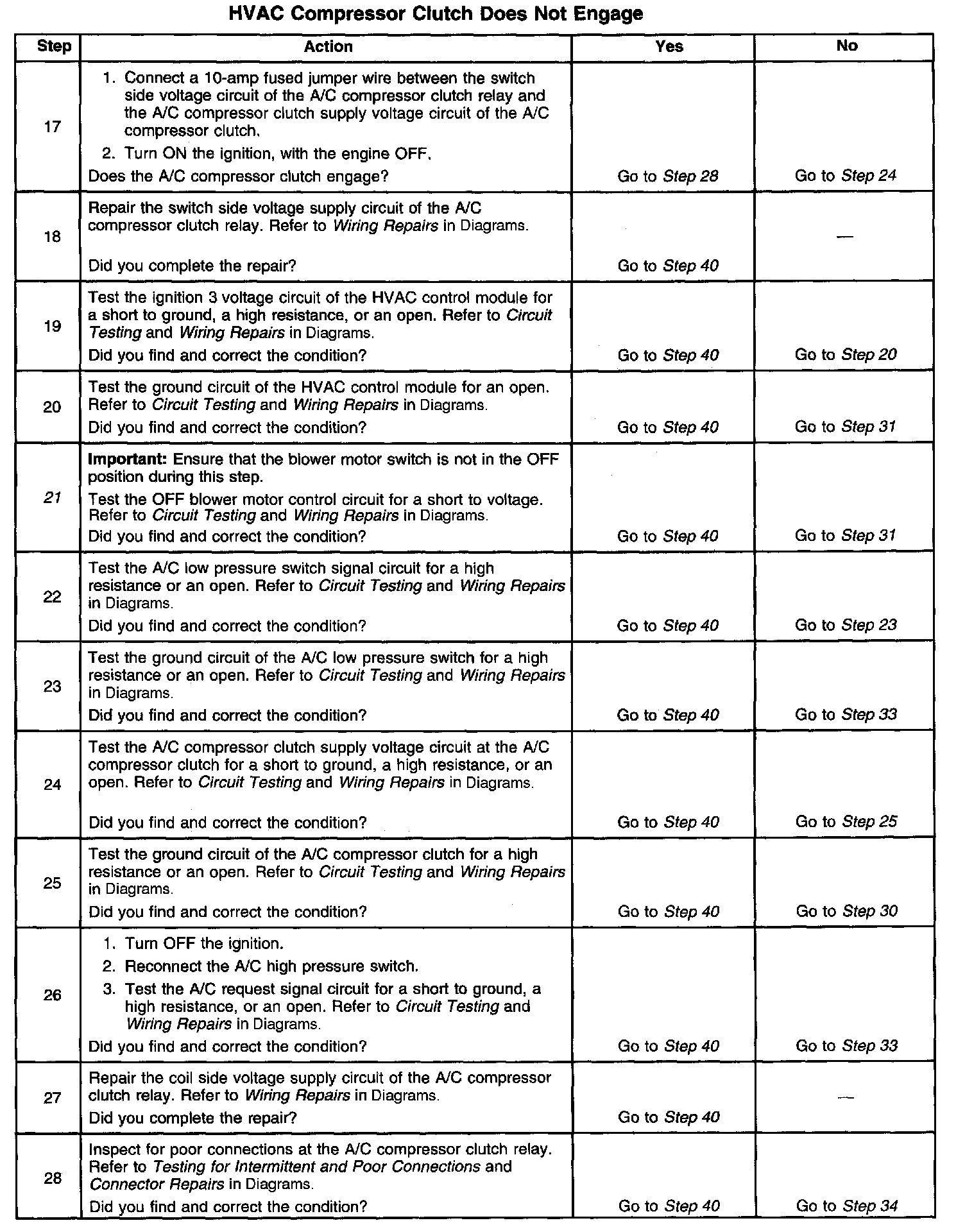 21. When the blower motor is in the OFF position, a voltage is applied to the OFF blower motor control circuit. The A/C system will not operate if a voltage is applied to the OFF blower motor control circuit.
