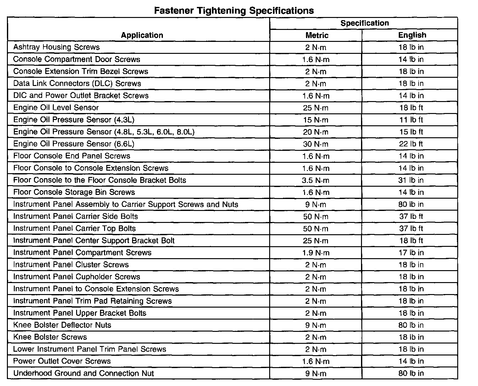 Fastener Tightening Specifications:
