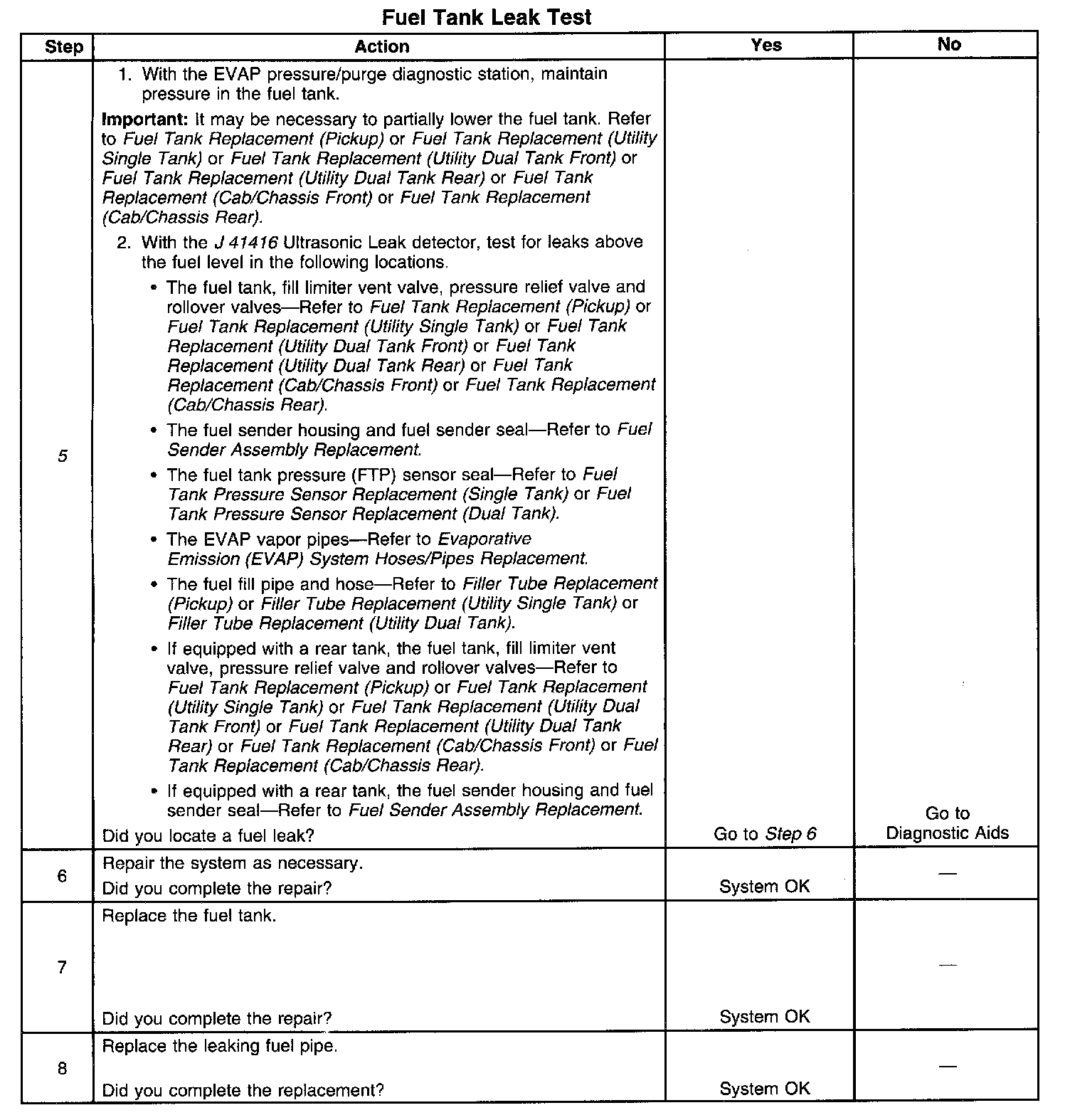The fuel tank leak test is used to locate any fuel or fuel vapor escaping the fuel tank area. Fuel vapors escaping above the fuel level will be detected when the Evaporative Emission (EVAP) diagnostics completes one test cycle. The Malfunction Indicator Lamp (MIL) will illuminate after the EVAP diagnostics completes two test cycles.