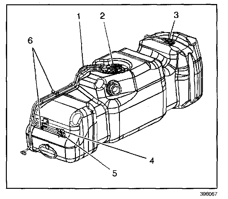 2. Connect the rear EVAP pipe (1) to the fuel sender (2), the fuel tank roll over valve (3), and the fuel tank clips (6).