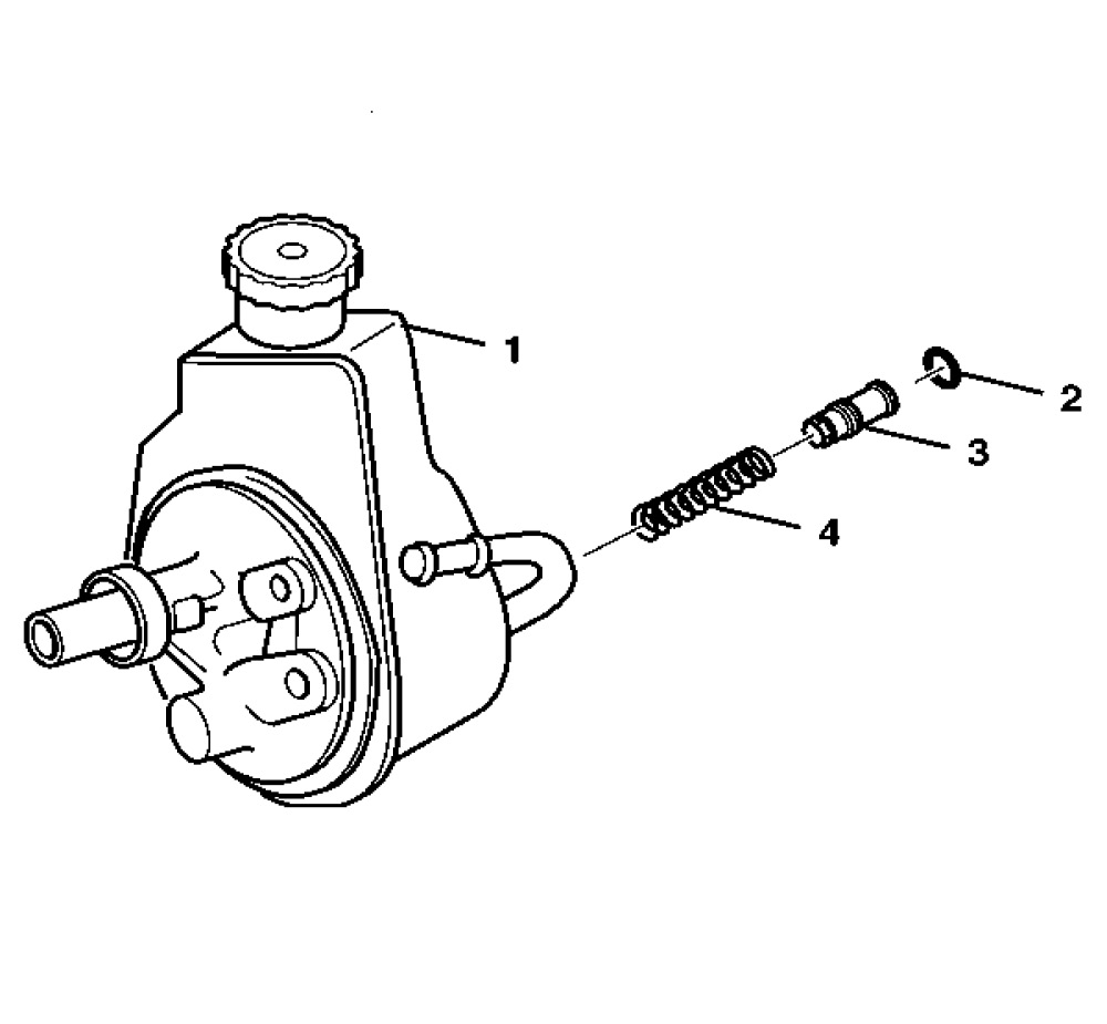 2. Remove the control valve assembly (3) from the pump housing (1). Make sure the flow control spring (4) does not fall out of the pump housing (1).