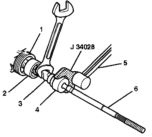 3. Install a torque wrench to the J 34028 to tighten the inner tie rod. Hold the rack while tightening the tie rod as shown.
