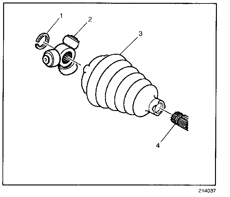 1. Place the new small seal clamp (2) onto the small end of the joint seal (1). Compress the joint seal (1) and small seal clamp (2) onto the halfshaft bar.