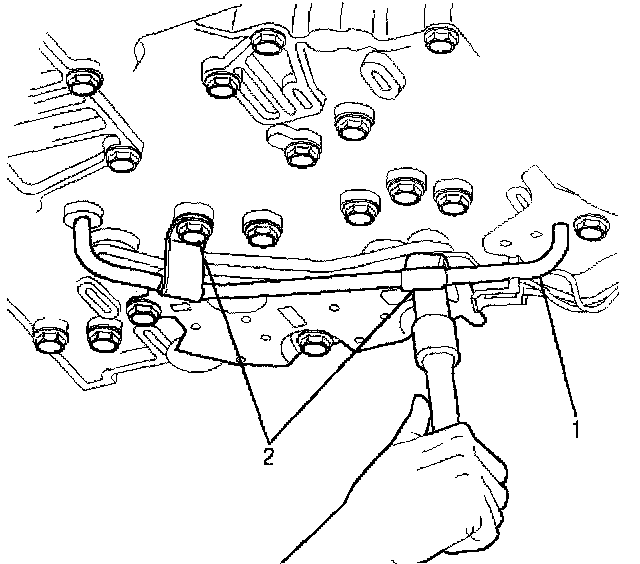 2. Remove the two bolts (2). Remove the reverse signal tube (1).
