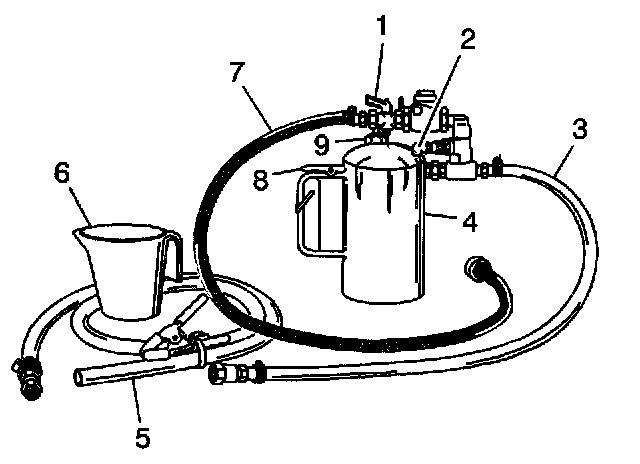 3. Install the fill cap (9) on the J 35944-A and pressurize the flusher tank (4) to 550 - 700 kPa (80 - 100 psi), using the shop air supply at the tank air valve (9).