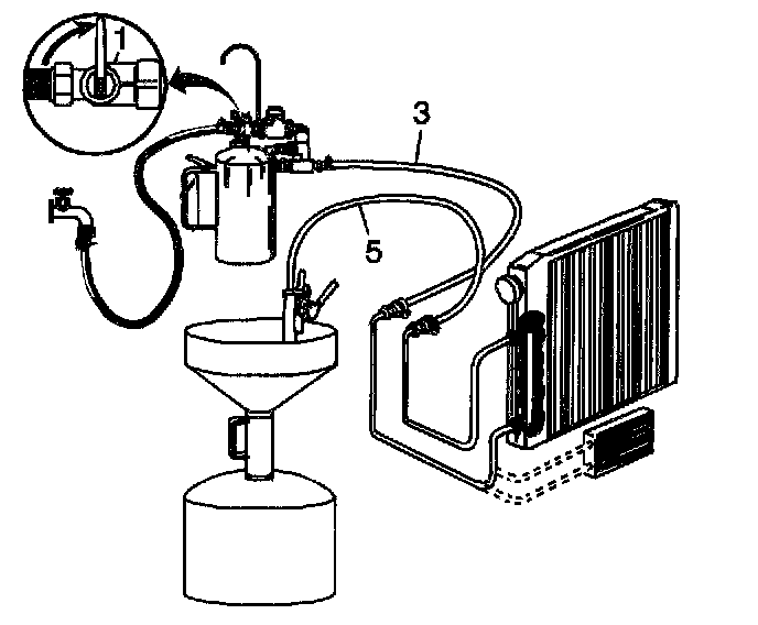 1. Turn the J 35944-A water supply valve (1) to the ON position and allow water to flow through the oil cooler and pipes for 10 seconds to remove any remaining transmission fluid. If water does not flow through the oil cooler and pipes, the cause of the blockage must be diagnosed and the plugged component must be repaired or replaced. Continue with the cooler flushing and flow check procedure once the blockage is corrected.
