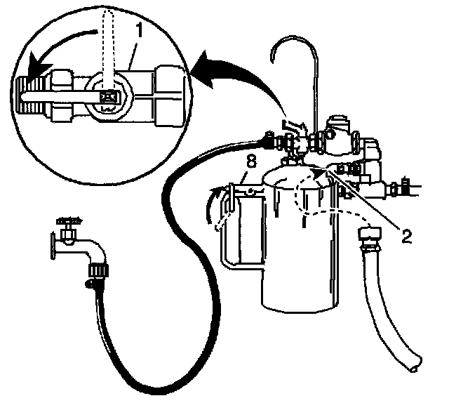 2. Turn the J 35944-A water supply valve (1) to the OFF position and clip the discharge hose (5) onto a suitable container, preferably with a lid, to avoid splash back.