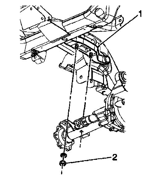 2. Install the upper differential carrier assembly mounting bolt (1) and the nut (2).