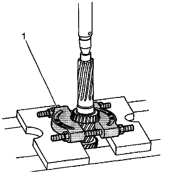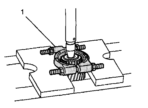 2. Using a hydraulic press and the J44749 (1), remove the countershaft intermediate case bearing. Use the flat side of the J 44749 against the bearing.