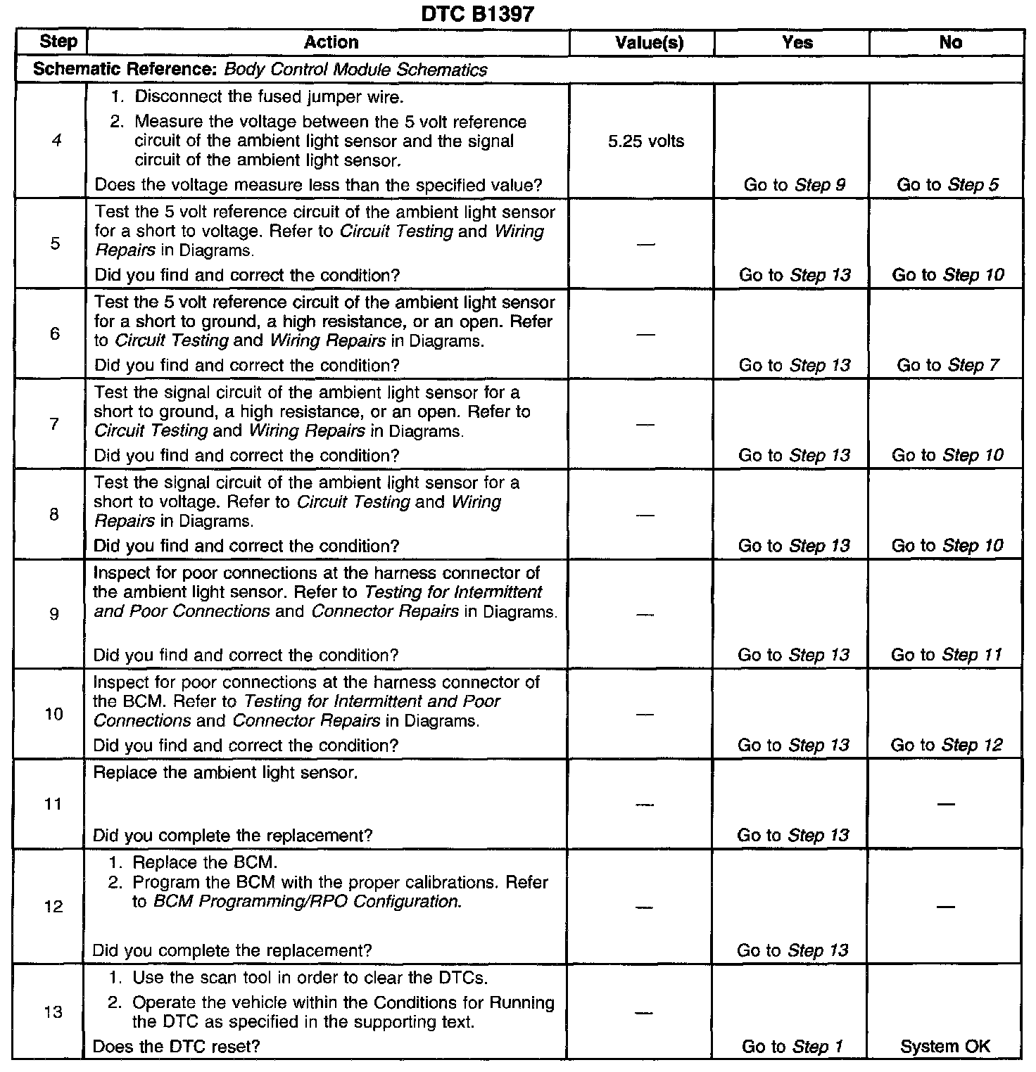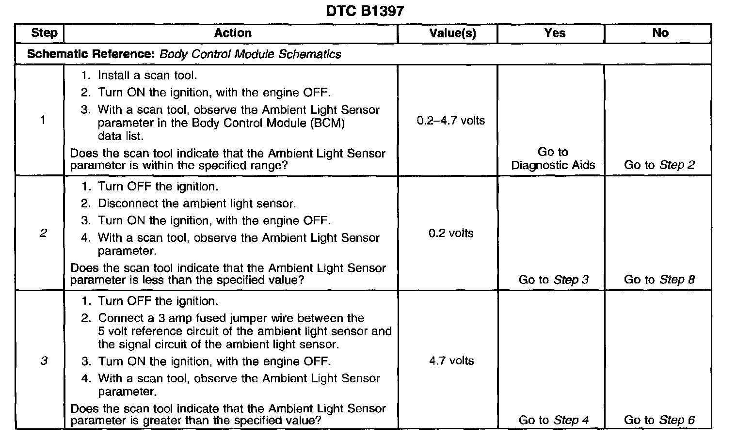 CIRCUIT DESCRIPTIONThe Body Control Module (BCM) provides a constant output reference voltage (5 volts) for the proper operation of the ambient light sensor. The constant output reference voltage supply ensures that variations in the output signal of the ambient light sensor are due to changes of the sensor rather than variations in the voltage supply. The BCM monitors the constant output reference voltage (5 volts) and sets a DTC when the output is not within the expected range (4.75 - 5.25 volts).
