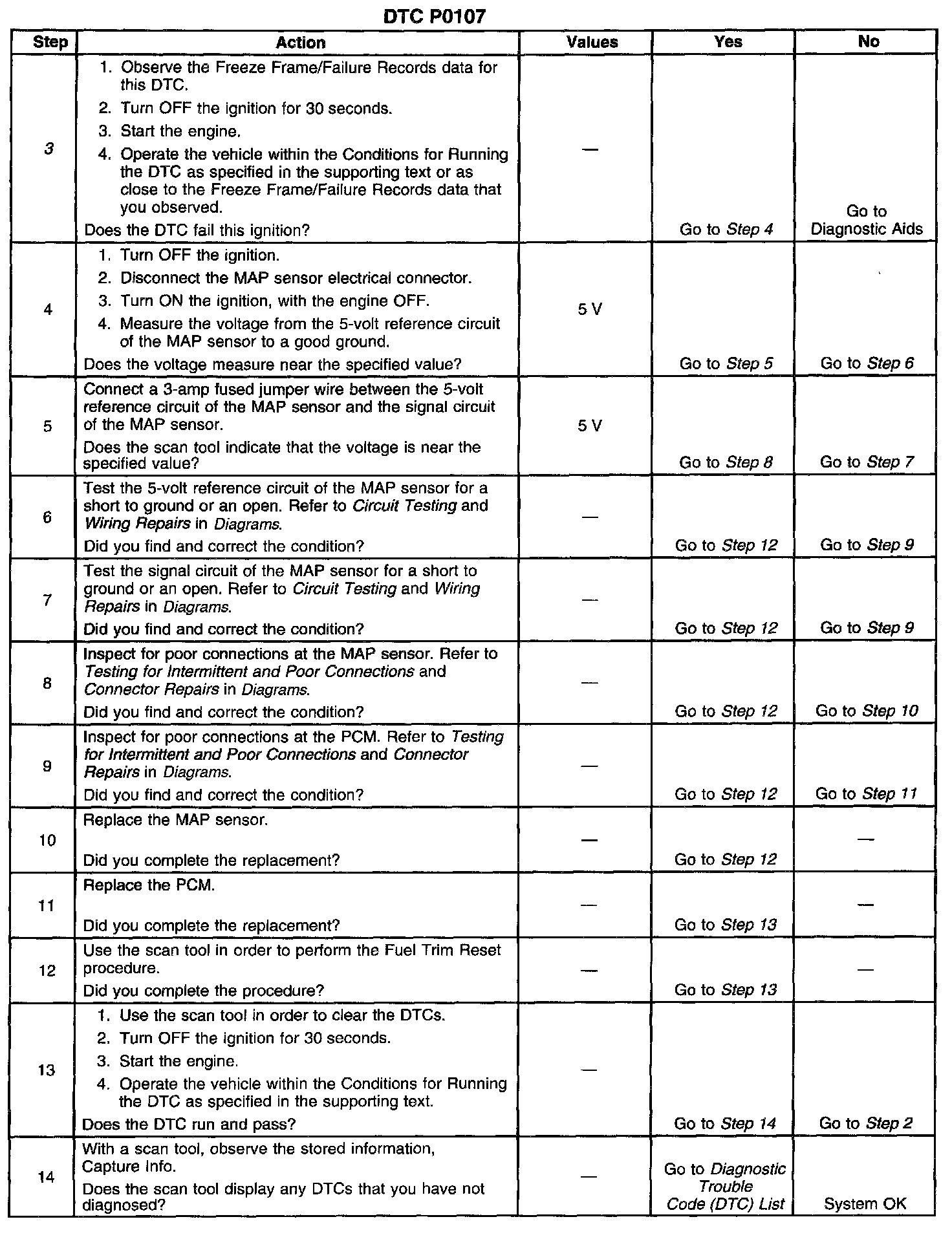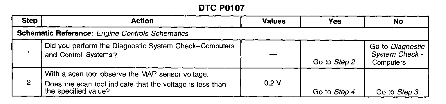 If the PCM detects a MAP sensor signal voltage that is excessively low, Diagnostic Trouble Code (DTC) P0107 will set.