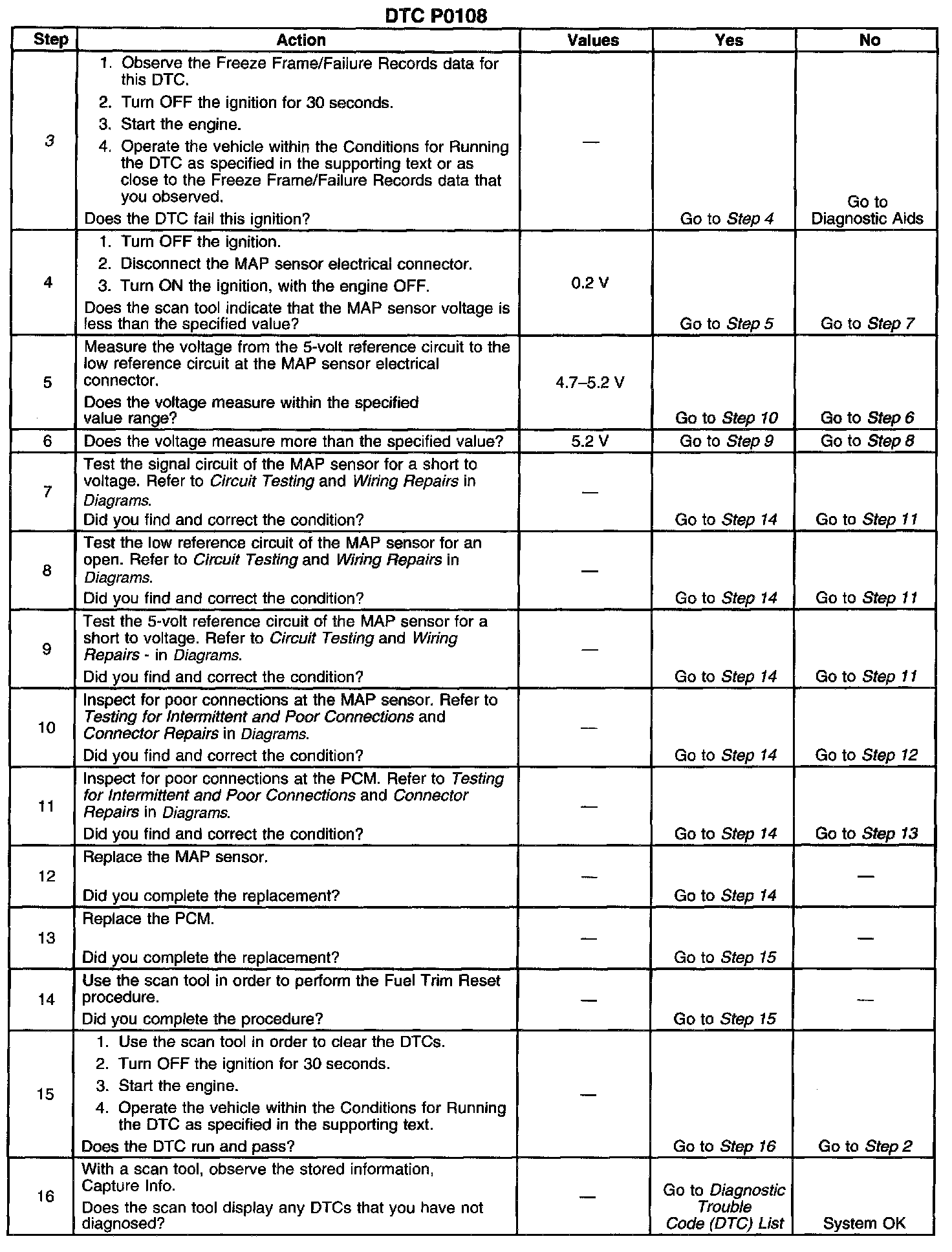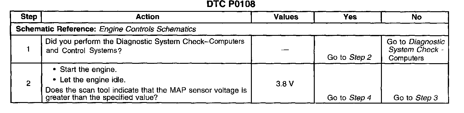 If the PCM detects a MAP sensor signal voltage that is excessively high, Diagnostic Trouble Code (DTC) P0108 will set.