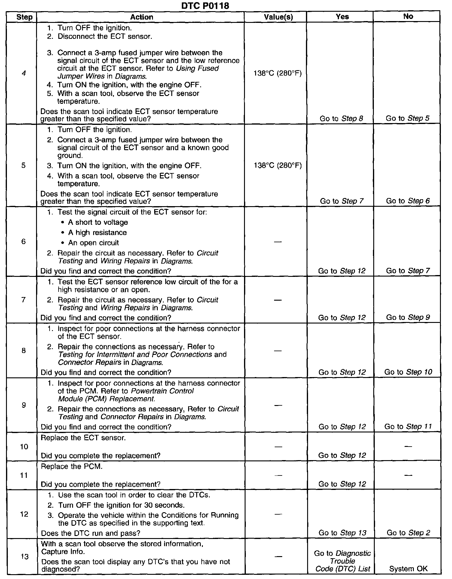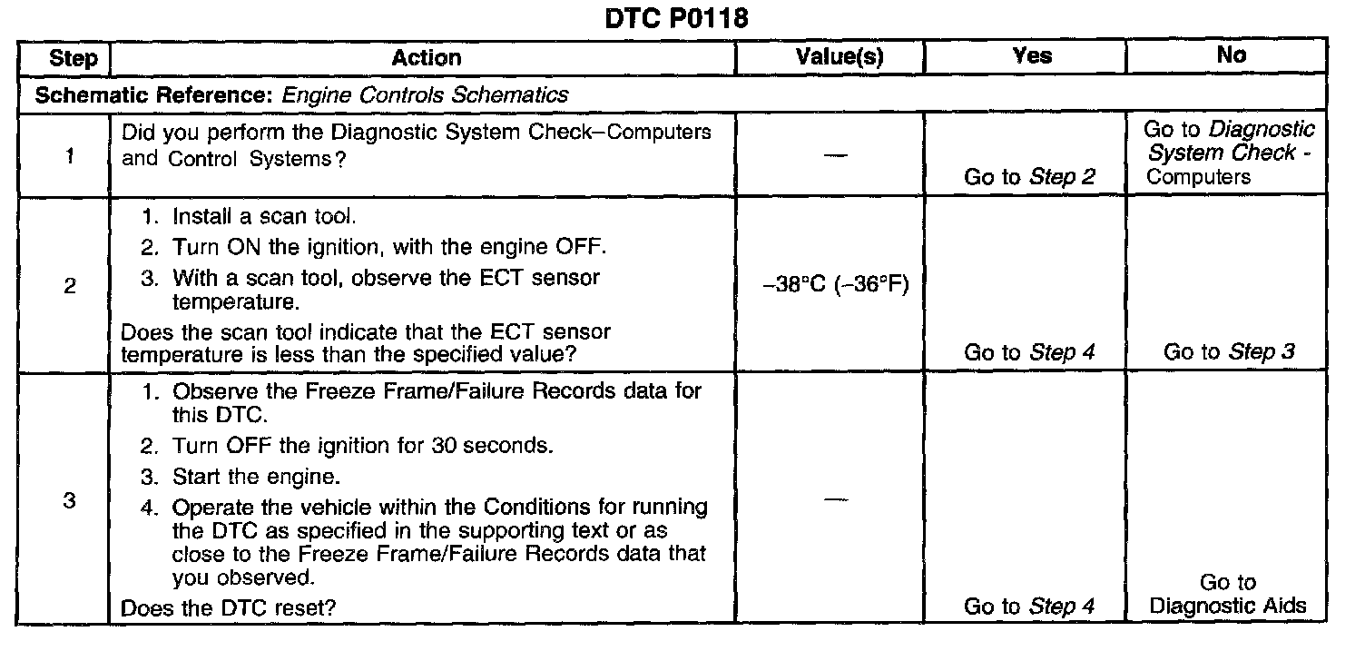 Use the Temperature vs. Resistance Table to test the ECT sensor at Various temperature levels in order to evaluate the possibility of a skewed sensor. A skewed sensor could result in poor driveability concerns. Refer to Temperature vs Resistance. [1][2]Electrical Specifications