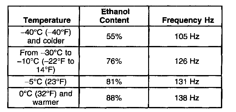 The system is designed for use of regular unleaded fuel to any ethanol concentration up to 85 percent (E85). When the ambient temperature drops below minus 10°C (14°F), a winter blend of 70 percent (E70), or less is recommended for cold weather starting. If the ethanol concentration is higher (E85), a DTC P0169 will set. Adding regular unleaded fuel to bring the alcohol content lower is recommended. Gold start cranking time should improve. This system is not designed for methanol fuel. Use of methanol fuel will cause the fuel composition sensor to read a higher percentage than that which exists and could cause a DTC P0169 to set, with a DTC P0179 also possible if the concentration is high enough (M85). The wrong fuel (M85) will also cause damage to the fuel system components and should be drained from the tank if found. Other contamination of alcohol blended fuels include water and salts. These compounds, if contained in the fuel, will also cause a higher than expected alcohol content reading causing a DTC P0169 to set. The table shows the maximum thresholds of a given ethanol content (percentage) versus the ambient temperature at which a DTC P0169 will set.