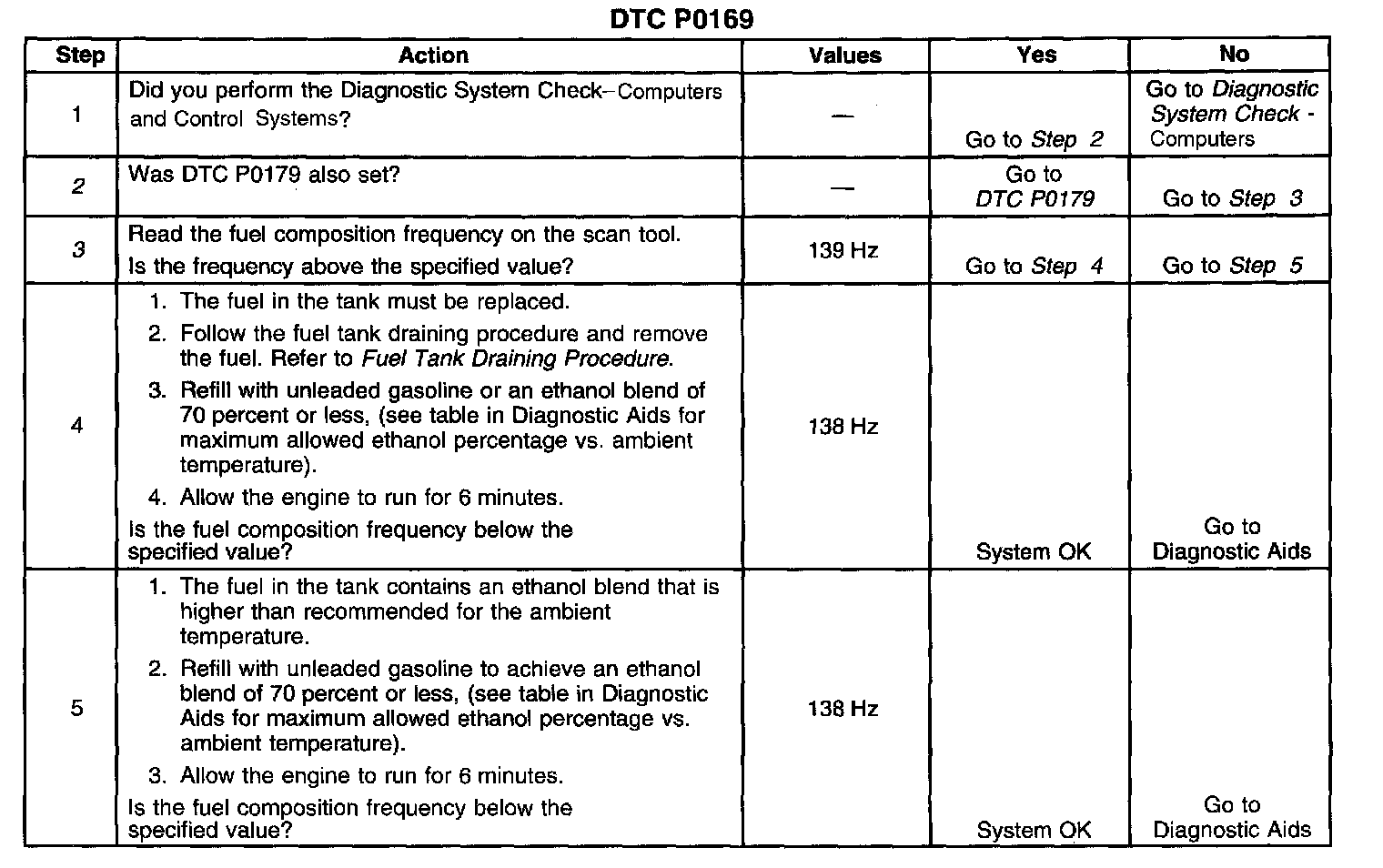 The PCM monitors the fuel composition frequency during the first 30 seconds of run time. If the fuel composition is above the given threshold for the ambient temperature, for 25 seconds of the 30 second interval, DTC P0169 will set. The table for temperature versus frequency thresholds is contained in Diagnostic Aids.