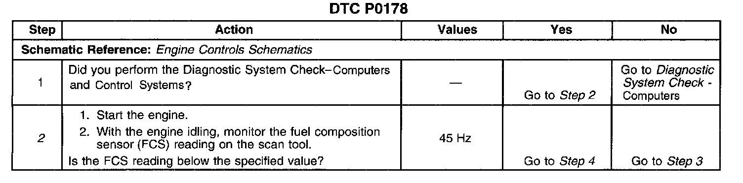 The fuel composition tester can be used to check the accuracy of the sensor if a fault is not isolated using this table. If the Fuel Test is performed before the electrical circuits have been tested using this table, the results will be in error.