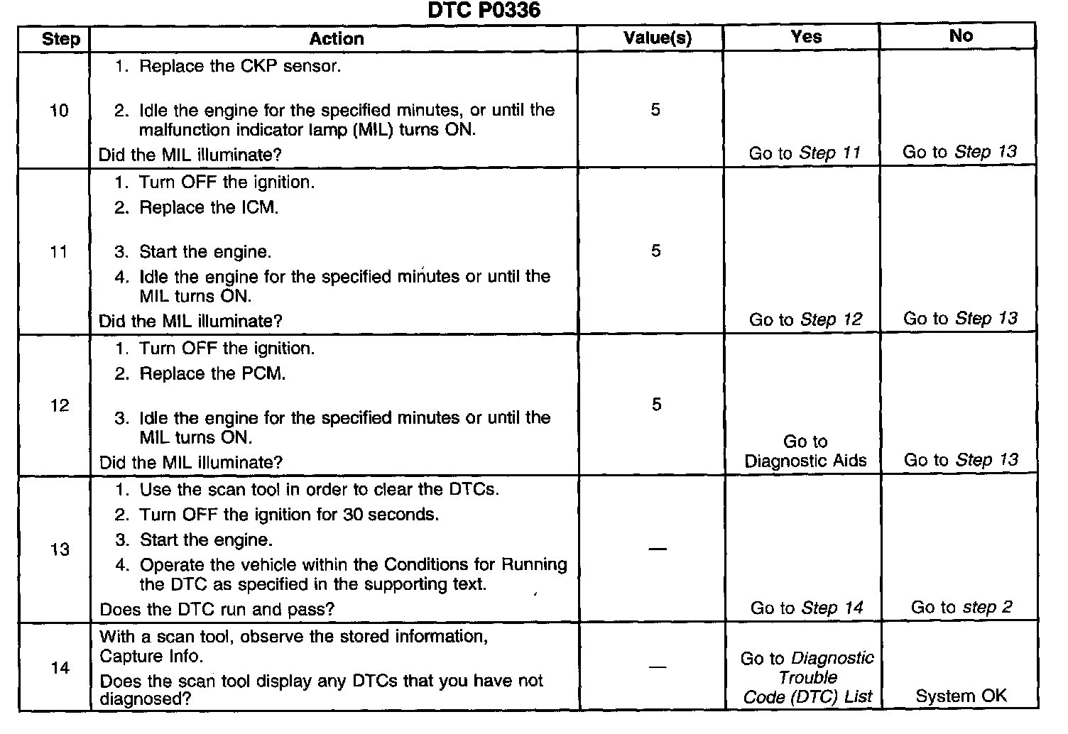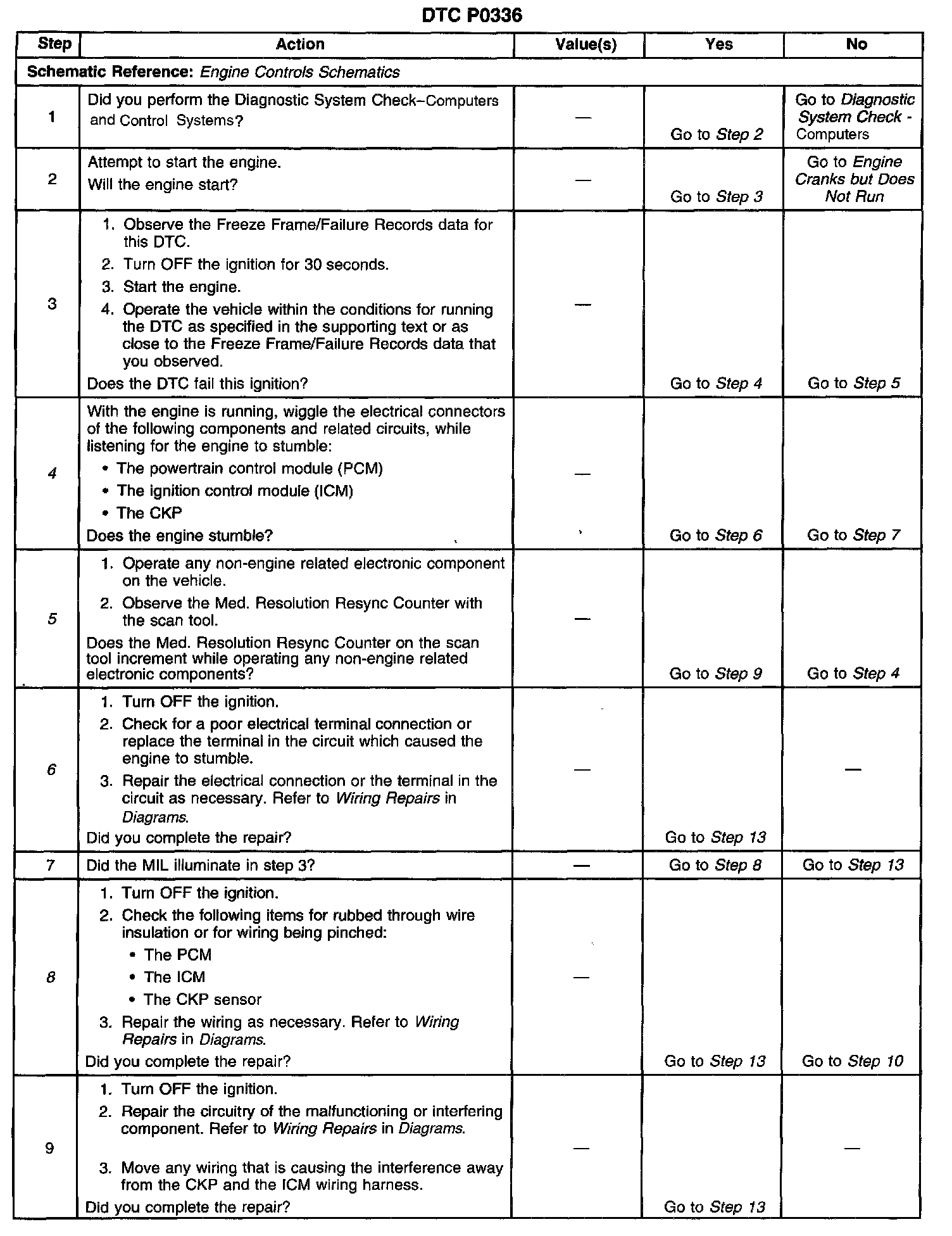 ^ If the complaint was Engine Cranks But Will Not Run, you may set a Diagnostic Trouble Code (DTC) P0336 when attempting to start the engine more than 15 times and the ignition is not turned OFF between attempts.